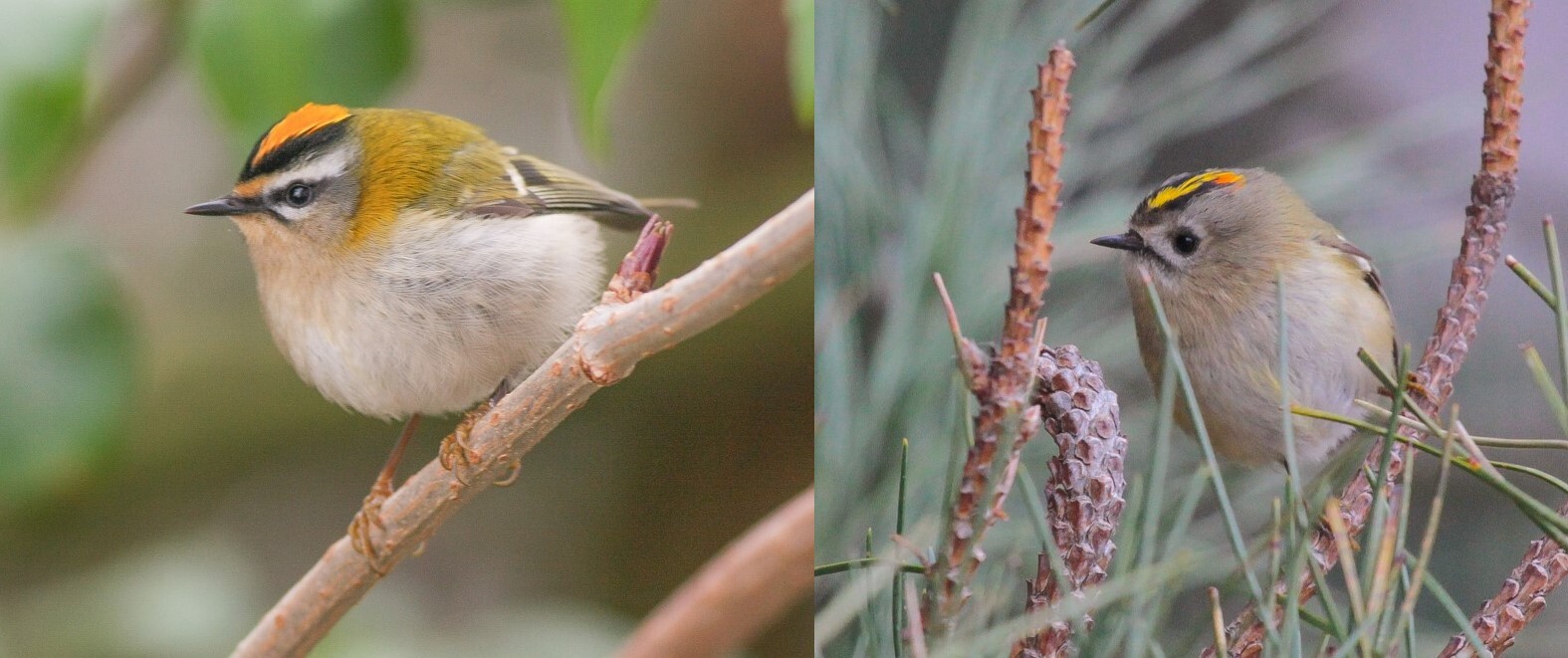 Tijdens onze excursies horen we soms mensen die denken dat het verschil ‘m zit in de kruinstreep, die bij de Goudhaan enkel geel is en bij de Vuurgoudhaan geel met oranje. Dat is echter niet het verschil tussen deze twee soorten, maar het verschil in geslacht. Zowel bij de Goudhaan als bij de Vuurgoudhaan heeft het vrouwtje enkel geel in de kruinstreep, terwijl het mannetje ook oranje veertjes in de kruinstreep heeft. Die oranje veertjes zijn soms lastig te zien, maar tijdens het zingen of als het mannetje zijn kruin opzet, zijn deze oranje veertjes zichtbaar.