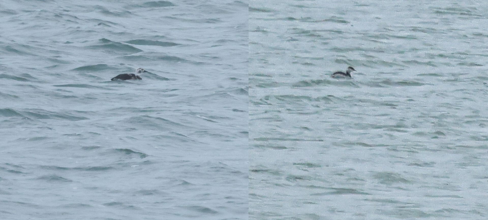 De eerste zeldzaamheid van de dag is binnen! De Kuifaalscholver hadden we ook wel een klein beetje verwacht deze excursie, maar de IJseend die opeens aan komt vliegen is wel een grote verrassing! Inmiddels is deze mooie eendensoort een echte zeldzaamheid geworden en het is pas de eerste die ik dit jaar bij de Zuidpier zie. De vogel plonst op afstand in zee en laat zich mooi door de telescoop bekijken. Na enkele minuten heeft de vogel het wel weer gezien en vliegt verder naar het noorden, waar we haar in de nog steeds aanhoudende wolk Jan-van-Genten zien verdwijnen.