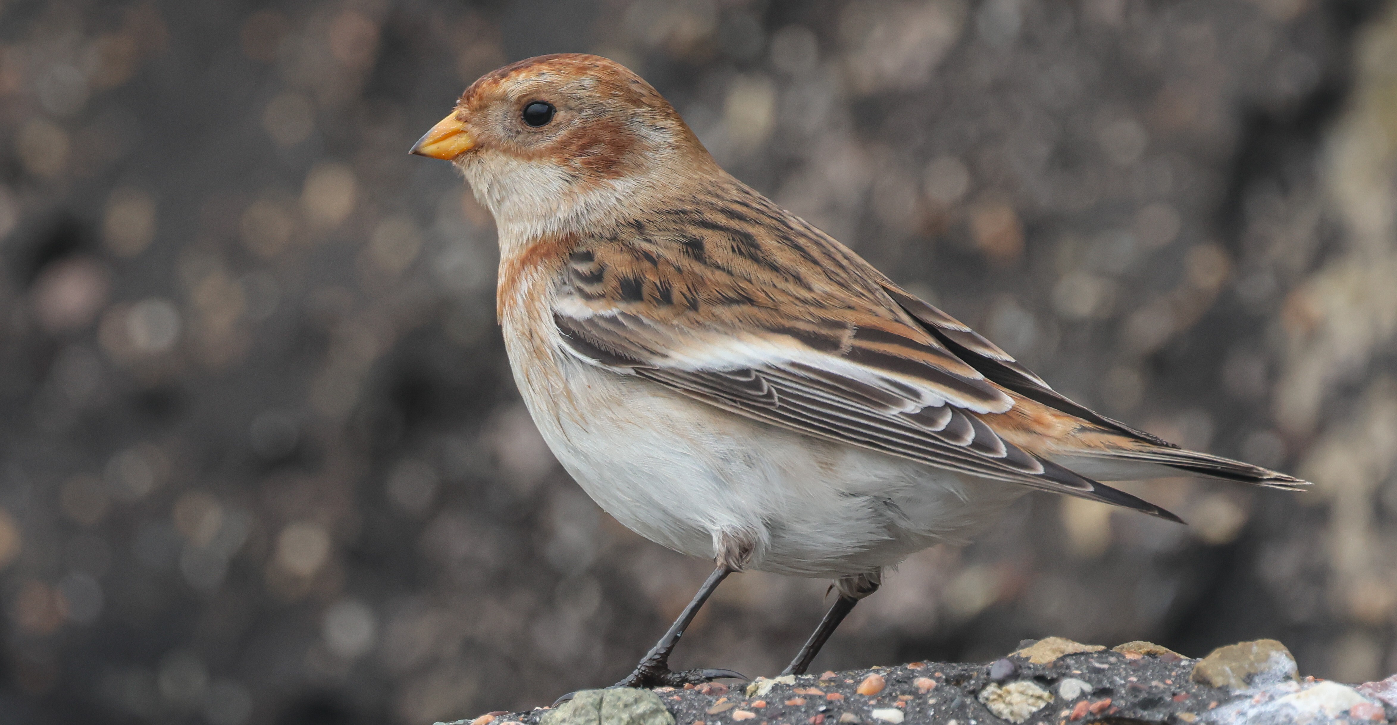 We hebben inmiddels een mooie soortenlijst bij elkaar geharkt, maar één wenssoort ontbreekt nog: de Sneeuwgors. De hele winter hangen er al enkele vogels op het strand aan de voet van de Zuidpier rond, maar mede door de drukte en de rondrennende honden laten ze zich hier soms lastig zien. Het duurt dan ook even, maar de aanhouder wint! Een Sneeuwgors komt over ons heen gevlogen en land iets verder op de blokken van de Zuidpier. Eenmaal gevonden blijkt hij best tam en laat zich mooi bekijken en fotograferen!