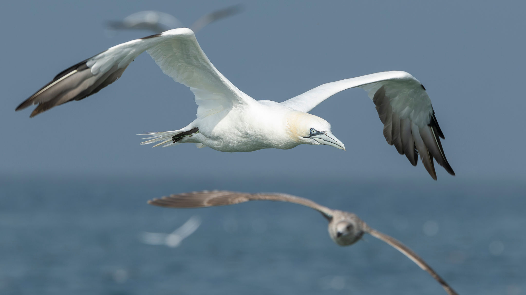 Na een klein uurtje melden de eerste Jan-van-genten zich. Ze hangen prachtig rond en boven het achtersteven van de boot, laten meerdere keren hun roep horen en uiteindelijk zien we ze in alle verschillende kleden. Ze storten zich in zee op de vis die we aanbieden en dobberen af en toe rustig op het water als de drukte van de meeuwen ze teveel lijkt te worden.