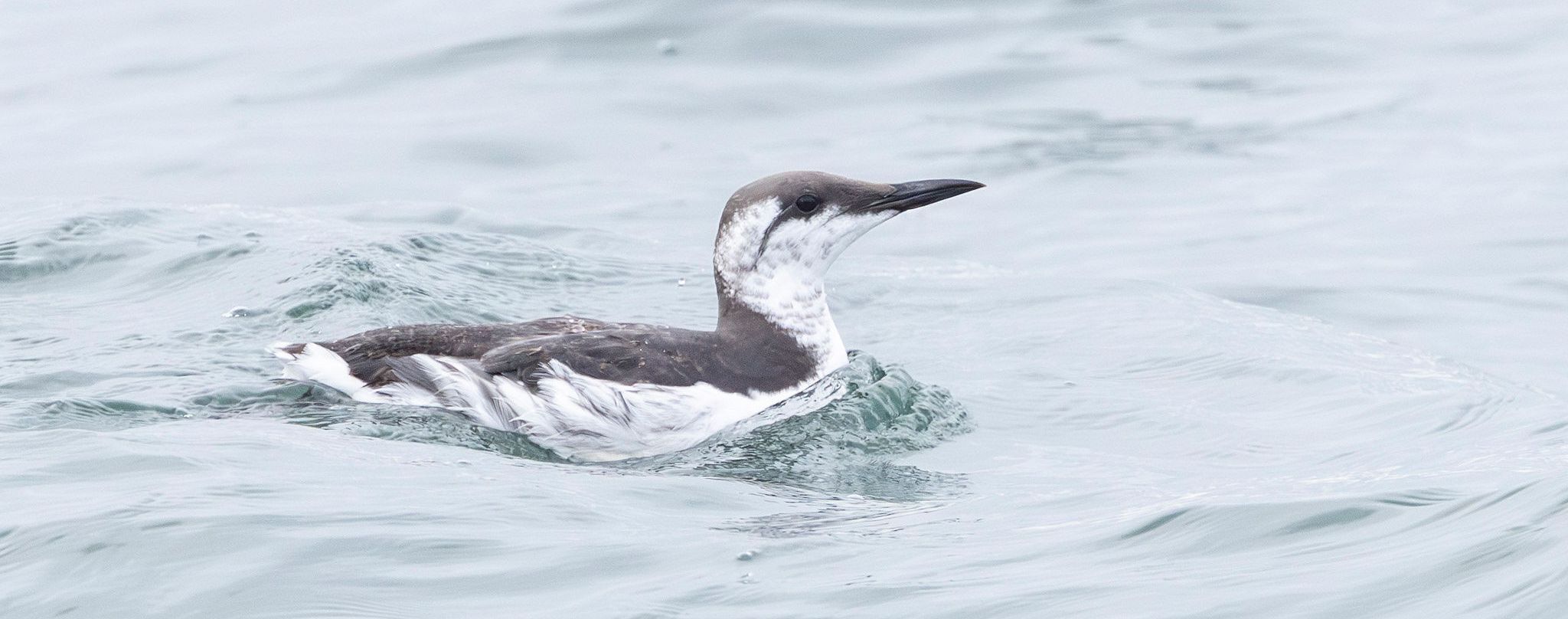 Als een soort deinende partyboot vol feestgangers varen we door richting het westen. We zien Bruinvissen en ook de eerste Alken en Zeekoeten laten zich goed zien. De chum werkt want naast de gebruikelijke soorten melden zich ook Geelpootmeeuw en meerdere Pontische Meeuwen achter het schip. We lezen wat ringen af en zien af en toe een Roodkeelduiker, wat Eiders en Zwarte Zee-eenden passeren.