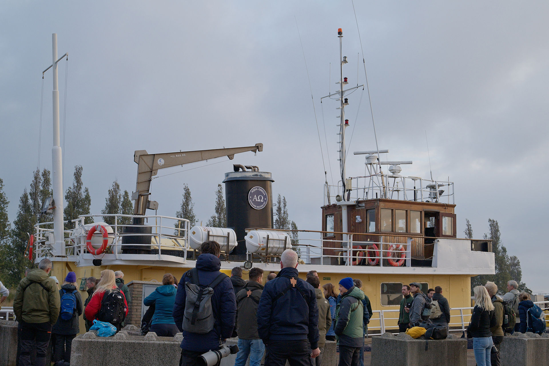 Na een autorit van bijna anderhalf uur gevuld met gesprekken over Zuidpooljagers, Grote Pijlen, Wenkbrauwalbatrossen en andere soorten die we ooit een keer van plan zijn te gaan ontdekken tijdens een van onze excursies komen we aan in de haven van Den Helder en laden we alles over op de ‘Hendrik Karssen’. Het prachtige oude marineschip dat we mogen gebruiken. De blauwe drugsvaten worden op het achterdek geplaatst, de broden worden daar ook opgestapeld en na een korte introductie gaan om 08:15 de trossen los.