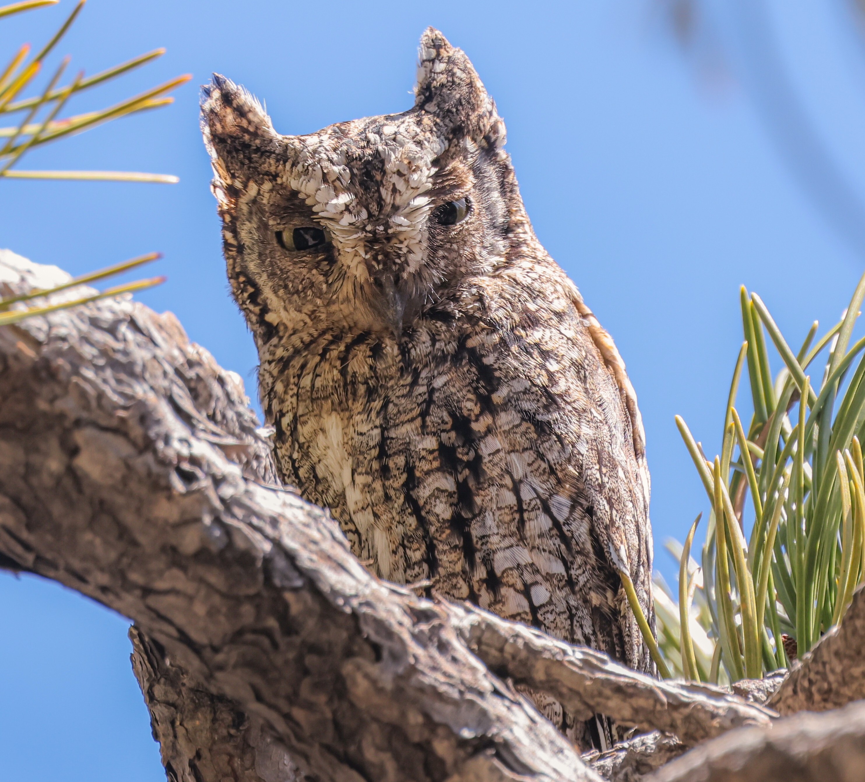 De Cyprusdwergooruil zit niet in de kruin of dicht tegen de stam, maar juist op één van de onderste takken goed verscholen tussen de dennennaalden. De vogel zit rustig op zijn tak naar beneden te staren en te bekijken wat er allemaal gaande is. Waarschijnlijk heeft hij net van een 20-minuten lange show genoten van 14 mensen die wanhopig op zoek waren maar niets konden vinden. Gelukkig besluit hij een showtje terug te geven en begint hij ineens weer aan een roepsessie. Wat een waanzinnig mooie waarneming en wat een geluk dat we ‘m hebben gevonden. Albert is de held van de dag!