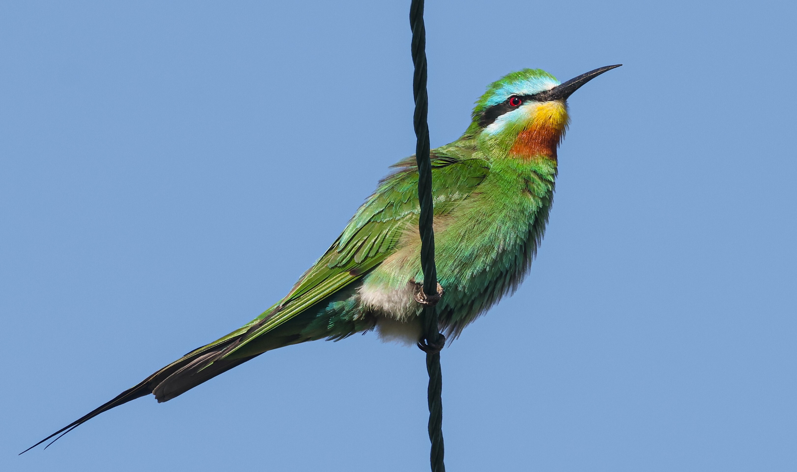 Het is bijna tijd om naar het ontbijt te gaan, maar op afstand ontdekken we twee bijeneters op een elektriciteitsdraad. De vogels zitten op grote afstand en met vol tegenlicht, maar door de telescoop valt de lange staart op. Dit moeten Groene Bijeneters zijn!