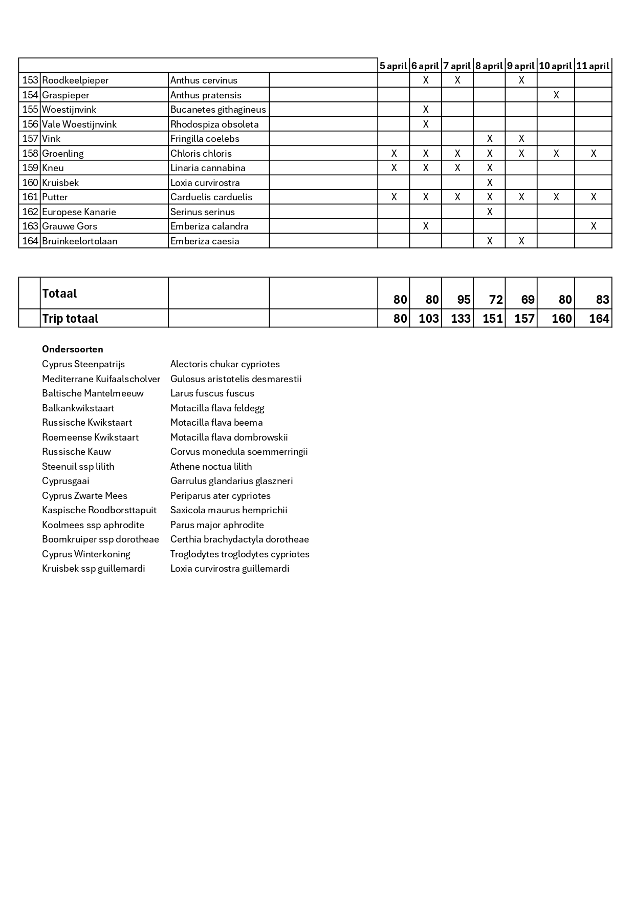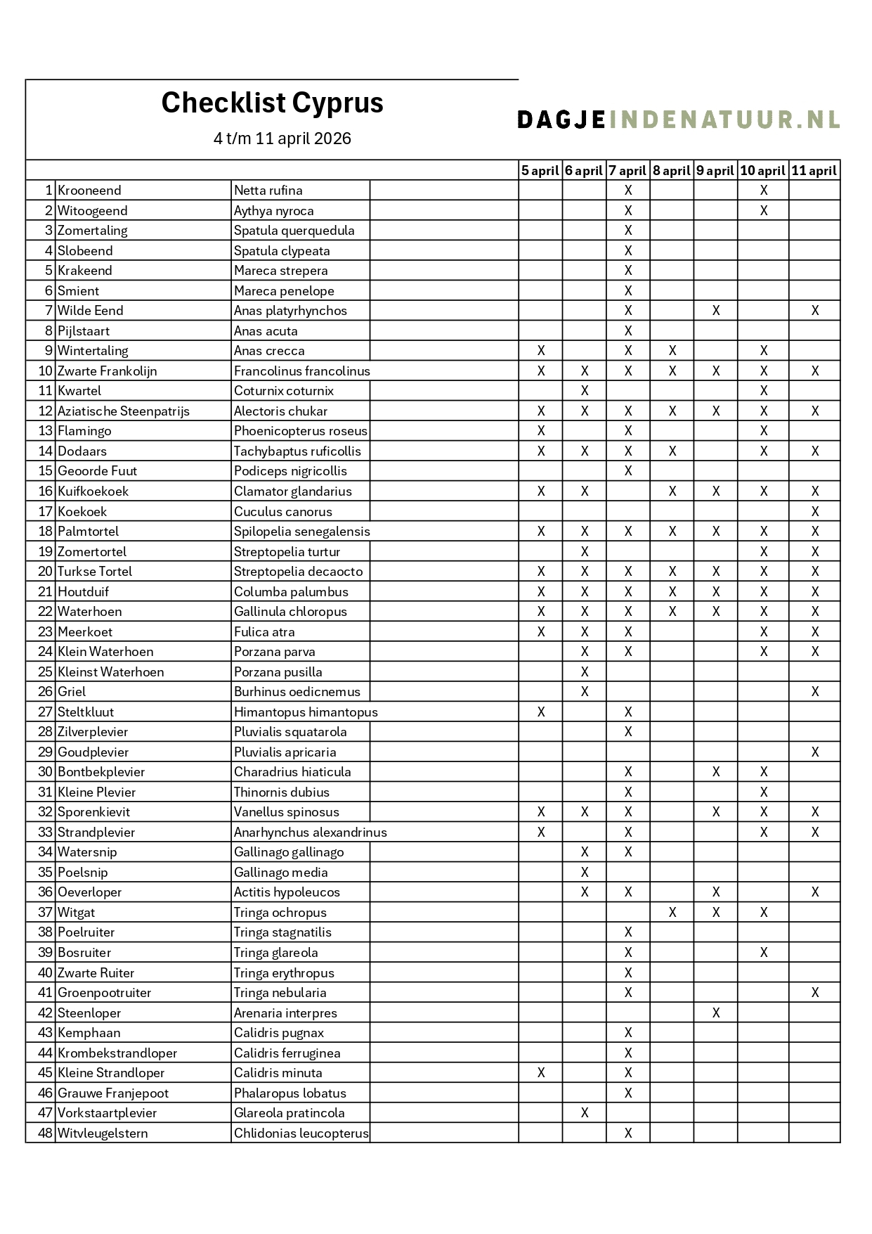 De vogels worden doorgeven in de zeldzaamhedenappgroep van Cyprus en terwijl we voldaan teruglopen naar de busjes arriveren ook de eerste twitchers. Na deze waarneming smaakt het ontbijt extra lekker! We pakken de spullen, nemen afscheid van onze twee hosts van de accommodatie en gaan op pad voor onze laatste dag vogelen op Cyprus. Onze vlucht gaat pas in de avond, dus we hebben alle tijd om nog wat laatste soorten te scoren!