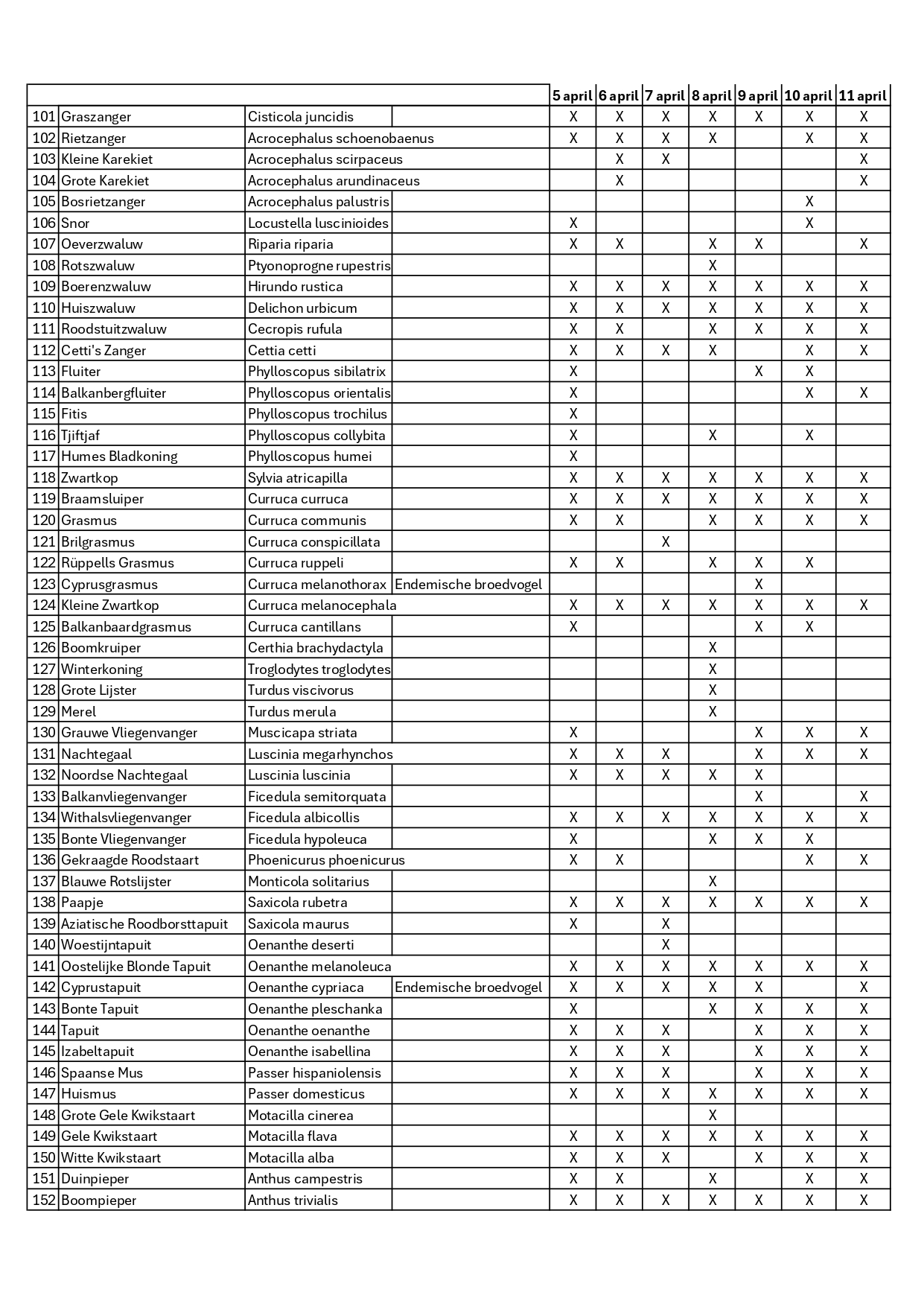 Het is opnieuw wat miezerig en op de eerste locatie lijkt er een fall van met name Zwartkoppen. Tientallen Zwartkoppen vliegen druk door de struiken en we zien ook Grauwe Vliegenvangers, Boompiepers, Nachtegalen en Balkanbaardgrasmussen. Op de rotsachtige hellingen zoeken we in de schaarse struiken naar onze doelsoort, maar we zien vooral veel Kleine Zwartkoppen. Enkele Aziatische Steenpatrijzen laten zich mooi zien en ook de Cyprustapuit is weer present. Enkel Gijsbert krijgt een flits van een mannetje Cyprusgrasmus te zien, maar die laat zich helaas niet terugvinden. Wel zien we nog een mooie Bruinkeelortolaan.